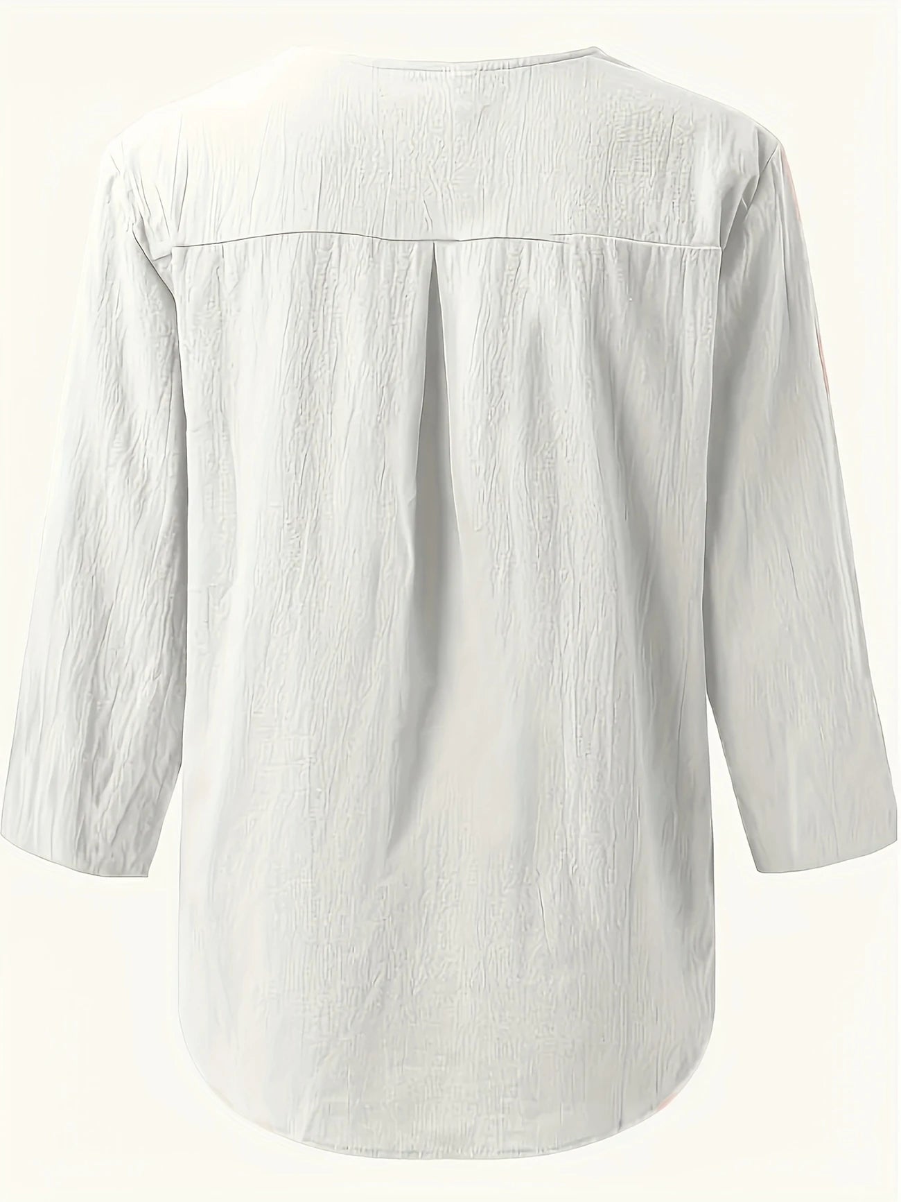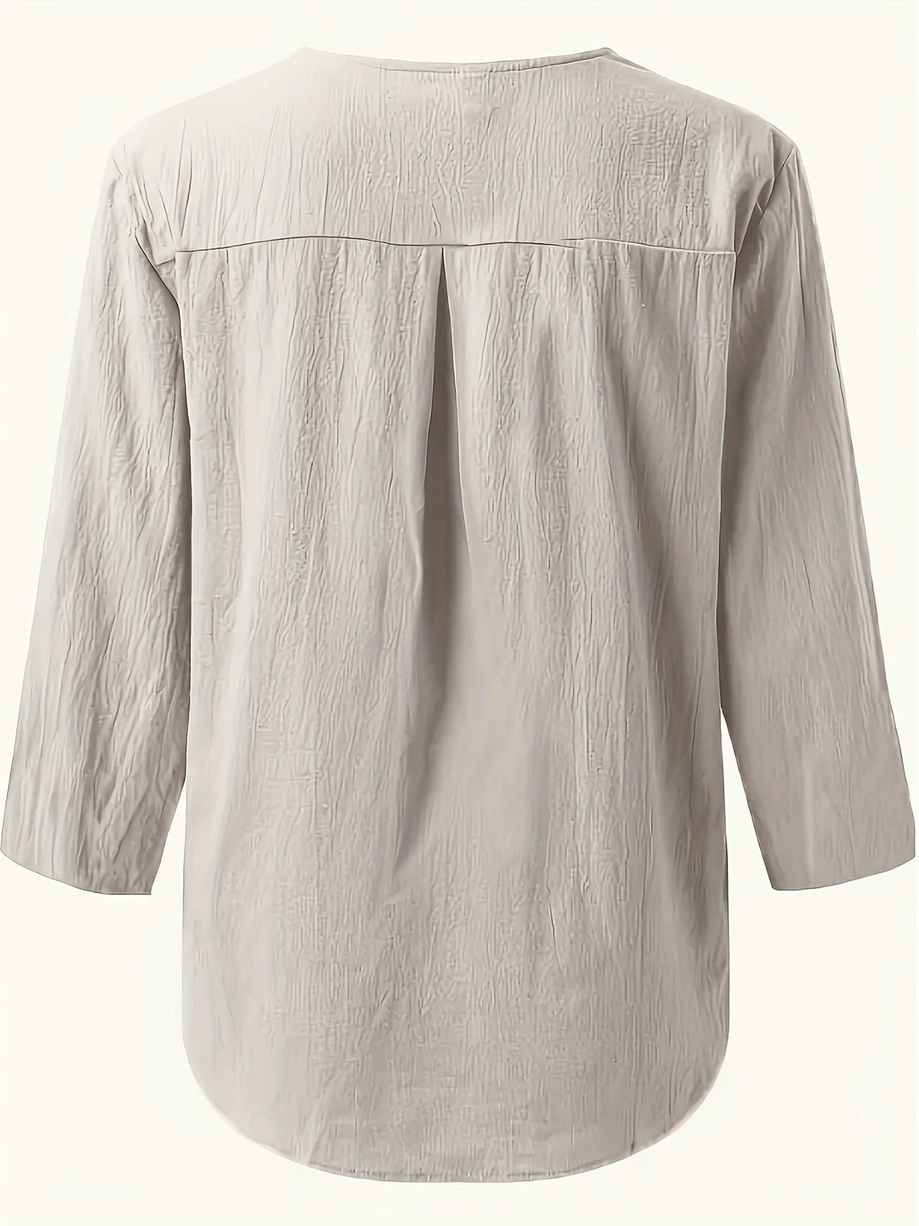 ✅Dettaglio bottoni in legno: Il trio di bottoni decorativi impreziosisce il davanti con un look rustico e artigianale. Sebbene non siano funzionali, aggiungono un tocco di interesse allo stile minimalista. La loro posizione dona equilibrio al disegno senza appesantirlo. È un dettaglio che valorizza delicatamente l'intera camicetta.